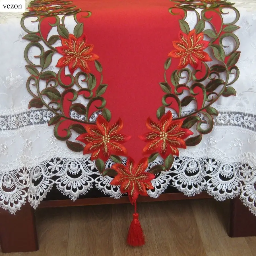 استعارات ل Vezon جديد عيد الميلاد البوليستر التطريز عيد الميلاد الجدول عداء الساتان سماط Cutwork تحديد الموقع الأحمر الجدول العلم منشفة القماش يغطي